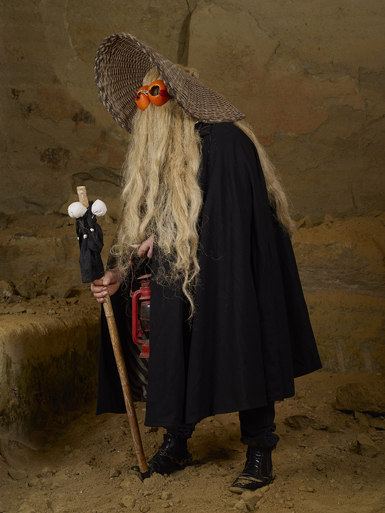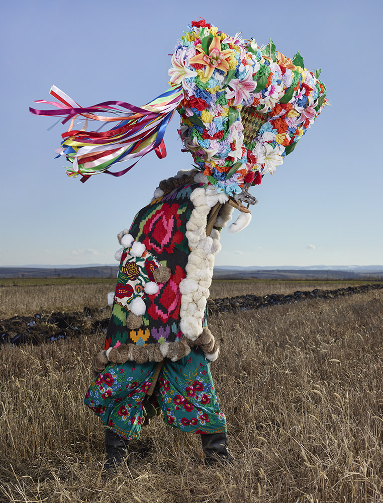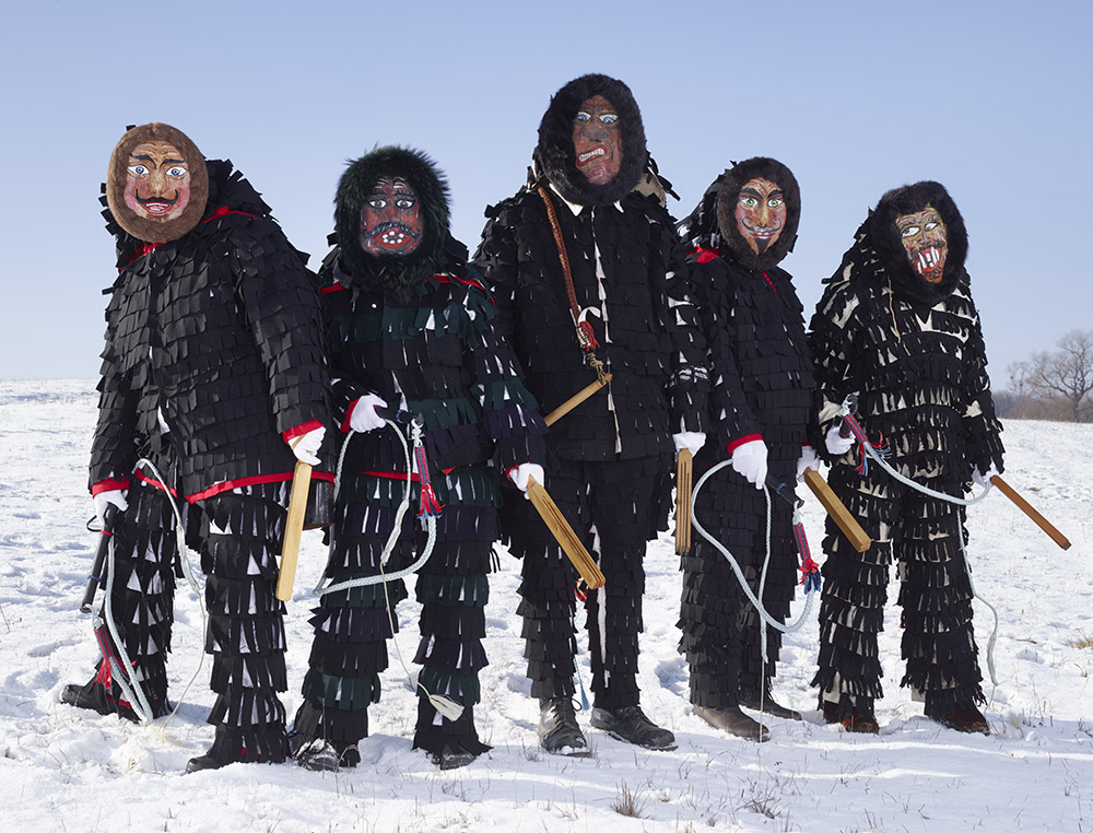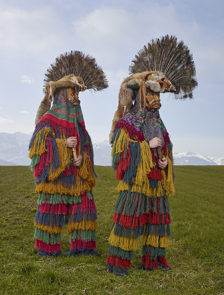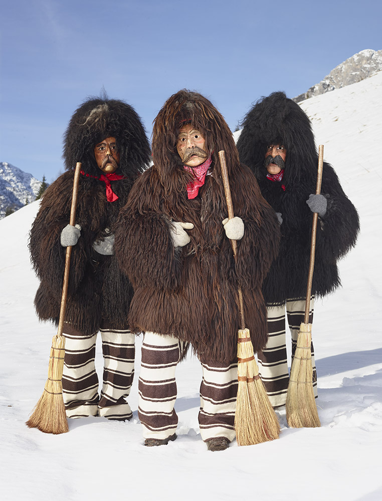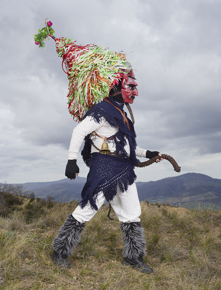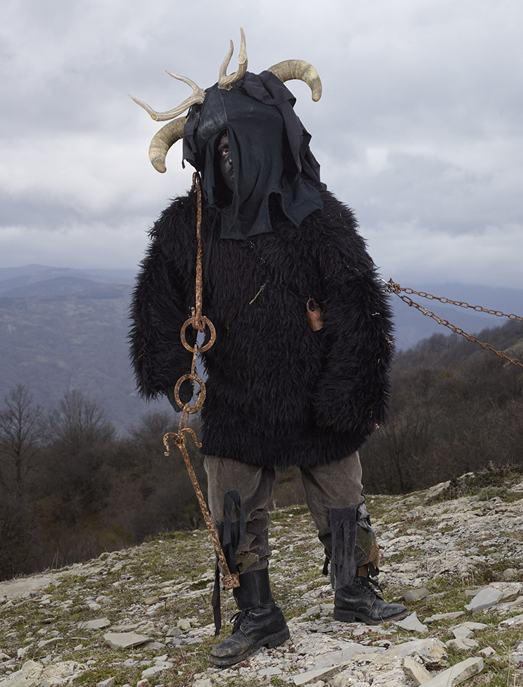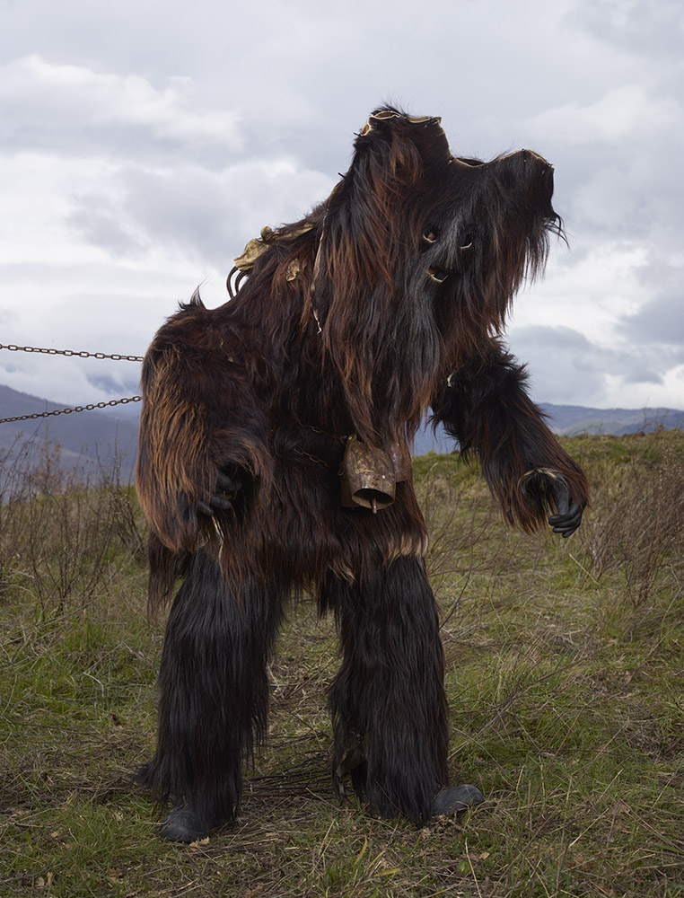 La tenue ne laisse entrevoir aucune parcelle de peau, la figure humaine se trouve totalement enfouie sous une avalanche de lourdes fourrures, laines, cloches, cornes et autres matières et accessoires. Là encore, photographiant hors périodes de festivals ou carnavals, il met en scène ces personnages dans un environnement naturel qu’il choisit souvent ample et dégagé. Il y a aussi cette autre liberté prise vis à vis des silhouettes elles-même, n’hésitant pas à en omettre certaines volontairement, et à en photographier d’autres de dos, revendiquant là la partialité de son inventaire, plus poétique que scientifique.