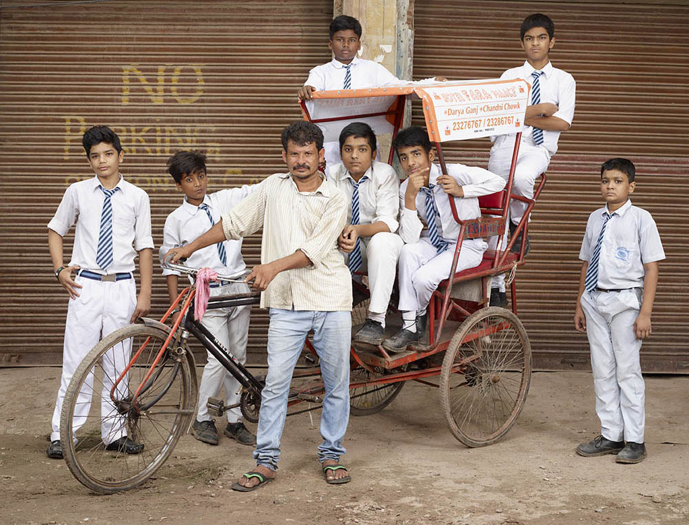 With School Chalo, the photographer embraces within the same frame the collective dimension, realizing no longer individual portraits but group portraits. Children in greater or lesser numbers, an adult and a rickshaw, a bicycle or a motorcycle: here are the crews photographed, following the same shooting protocol adopted some twenty years earlier. In other words, a posed and theatrical way, taking care of the attitudes as much as the choice of the environment. From one image to another, from a rickshaw to its sidekick painted in the colors of this other school, from a driver to another father, from turbans to tunics, we guess castes and religious affiliations. At the foot of their rickshaw or at their sides, these figures form a precipitate of the contemporary society of New Delhi.